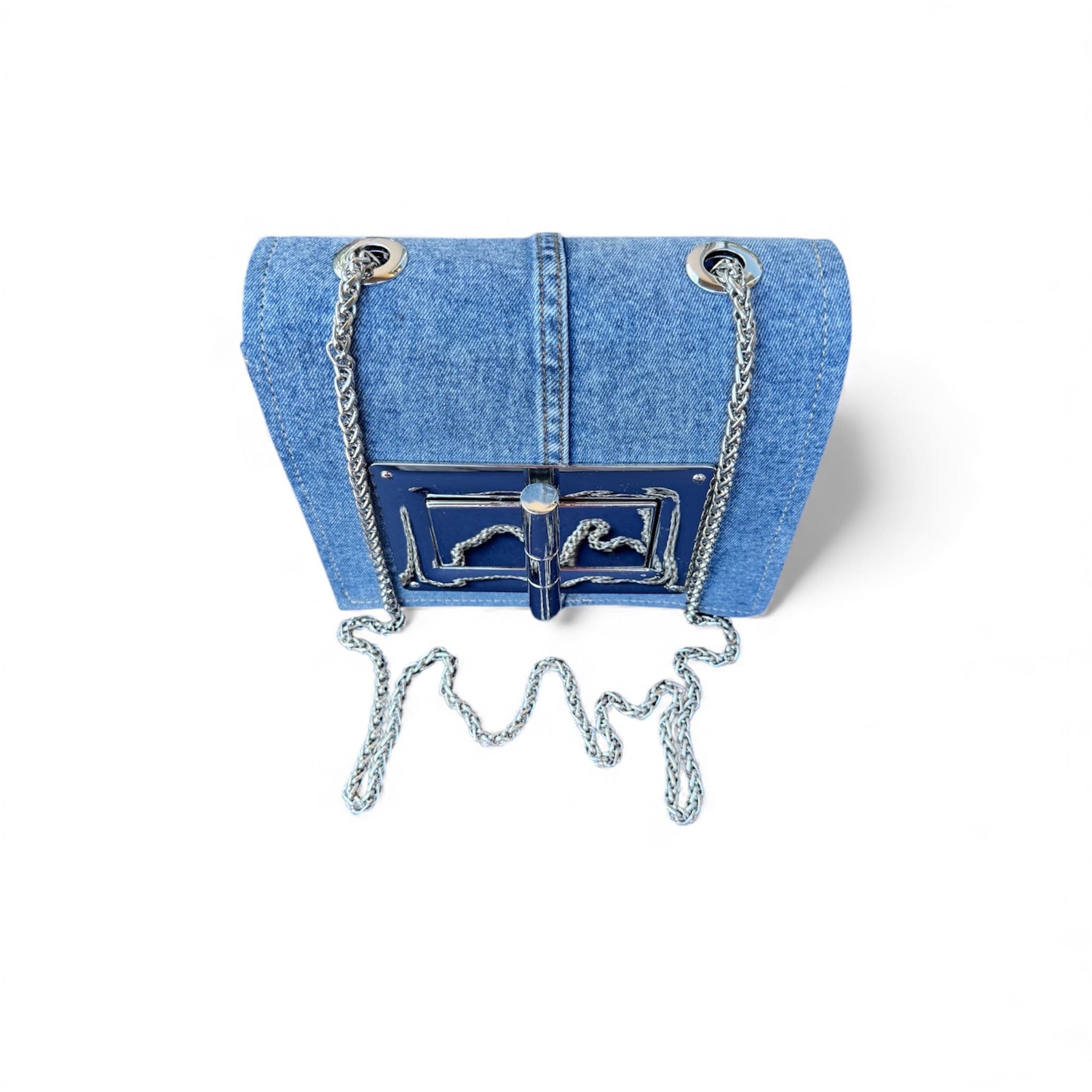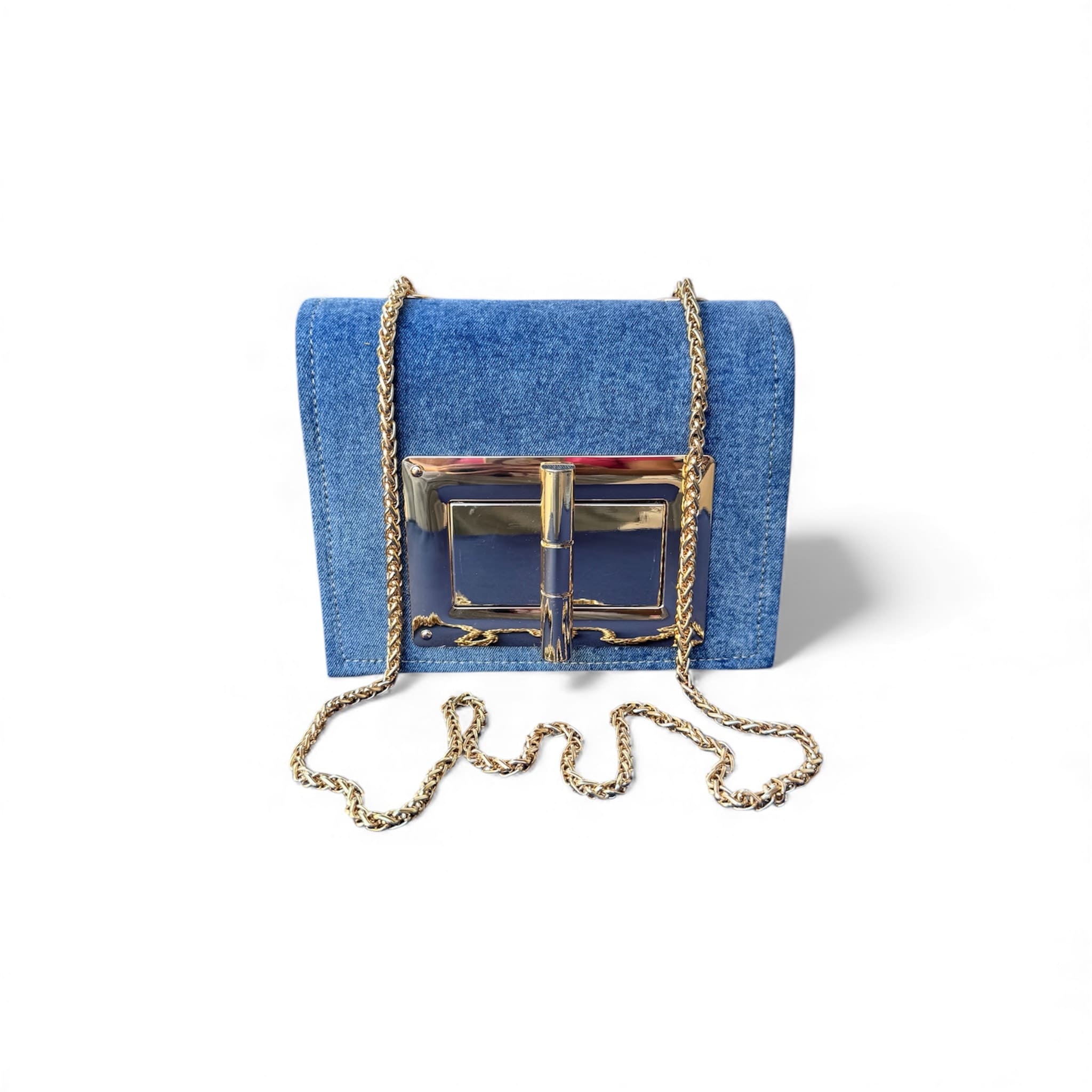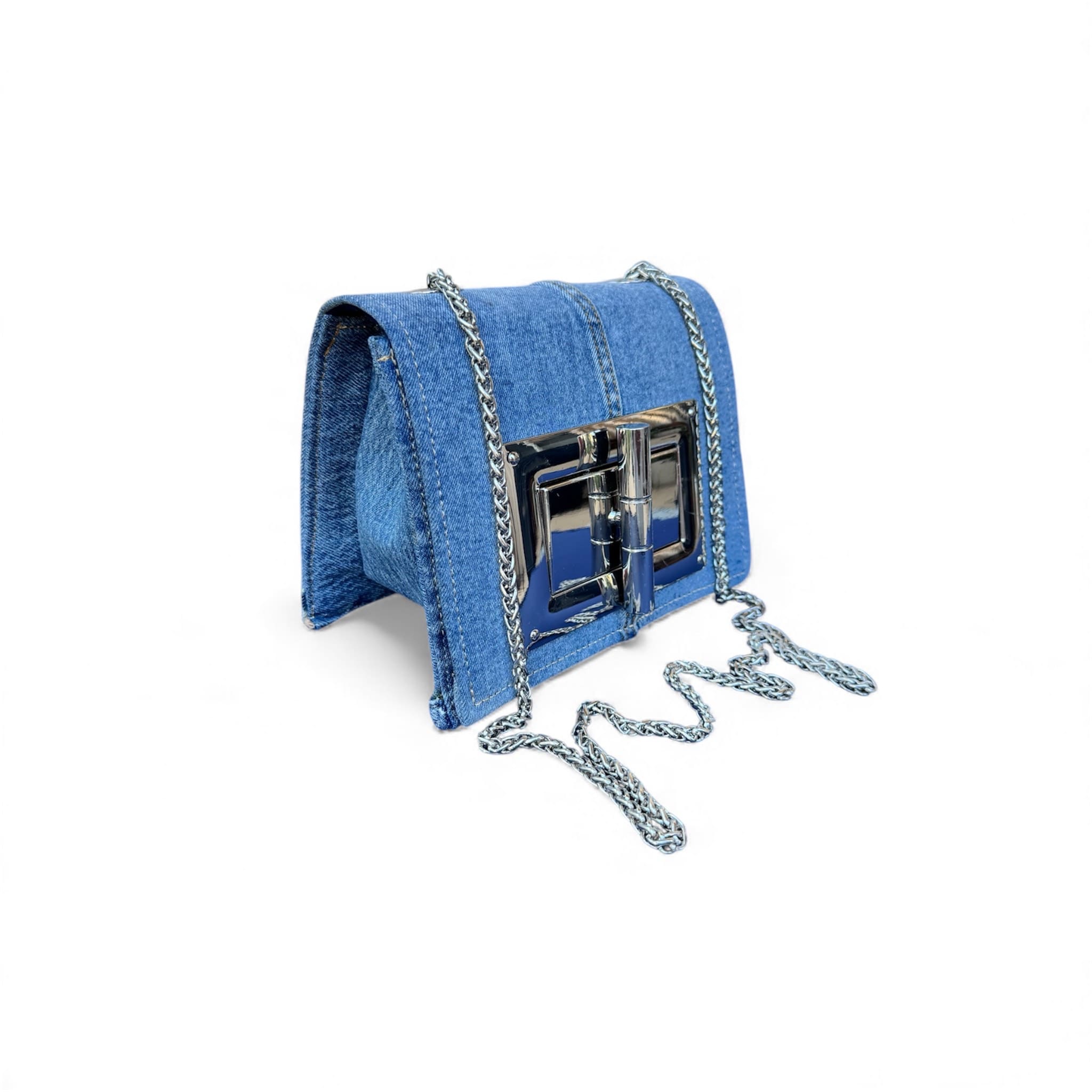 BLUE DENIM BAG WITH AN ELEGANT DESIGN AND BIG METALLIC CLAPS PERFECT FOR AN SPECIAL OCCASION.