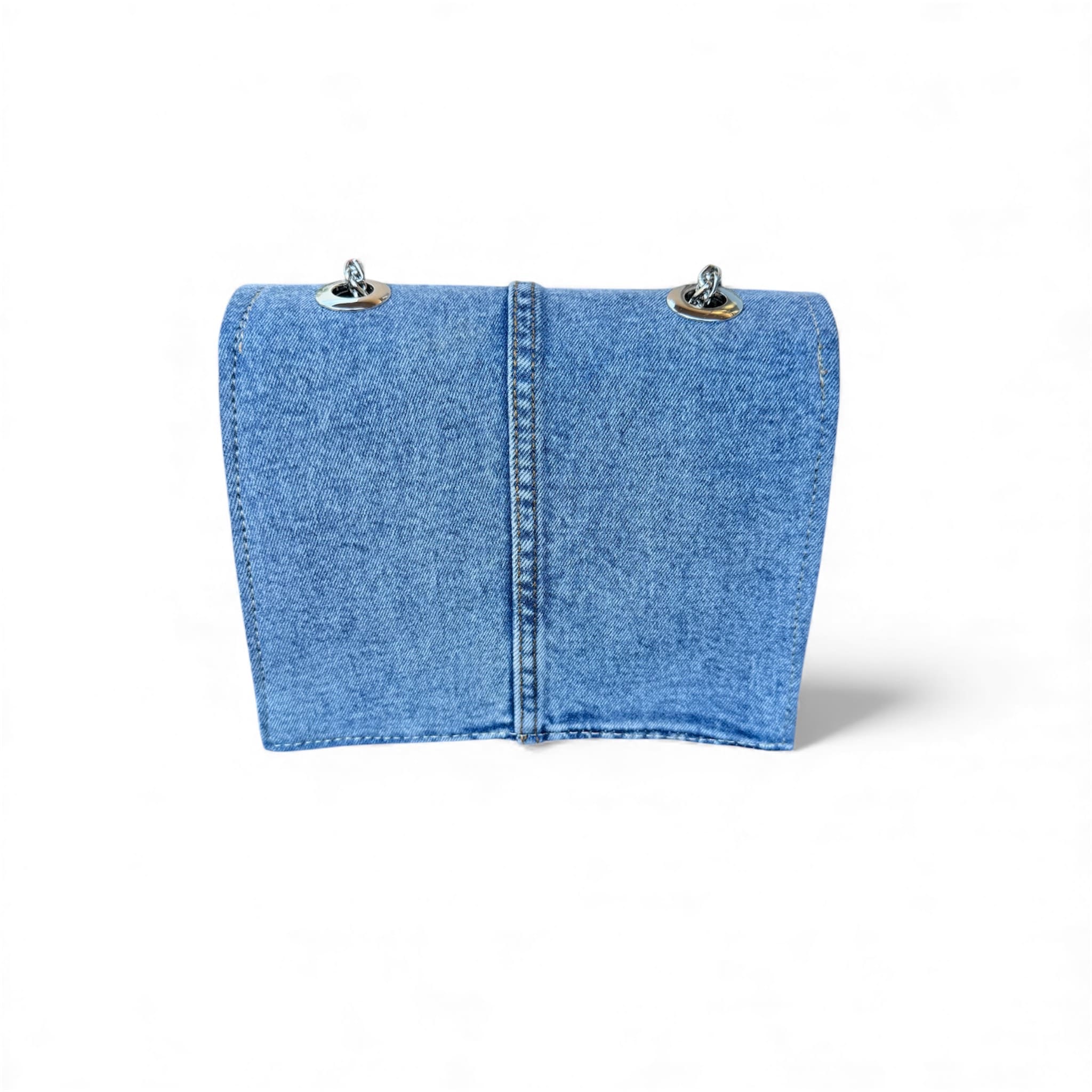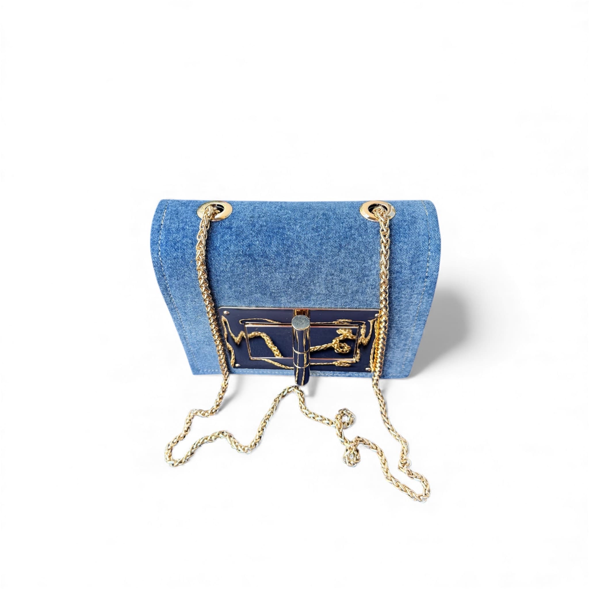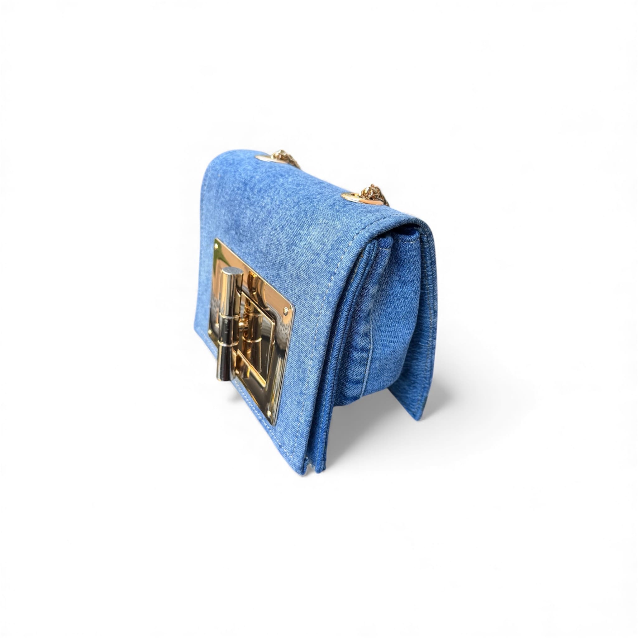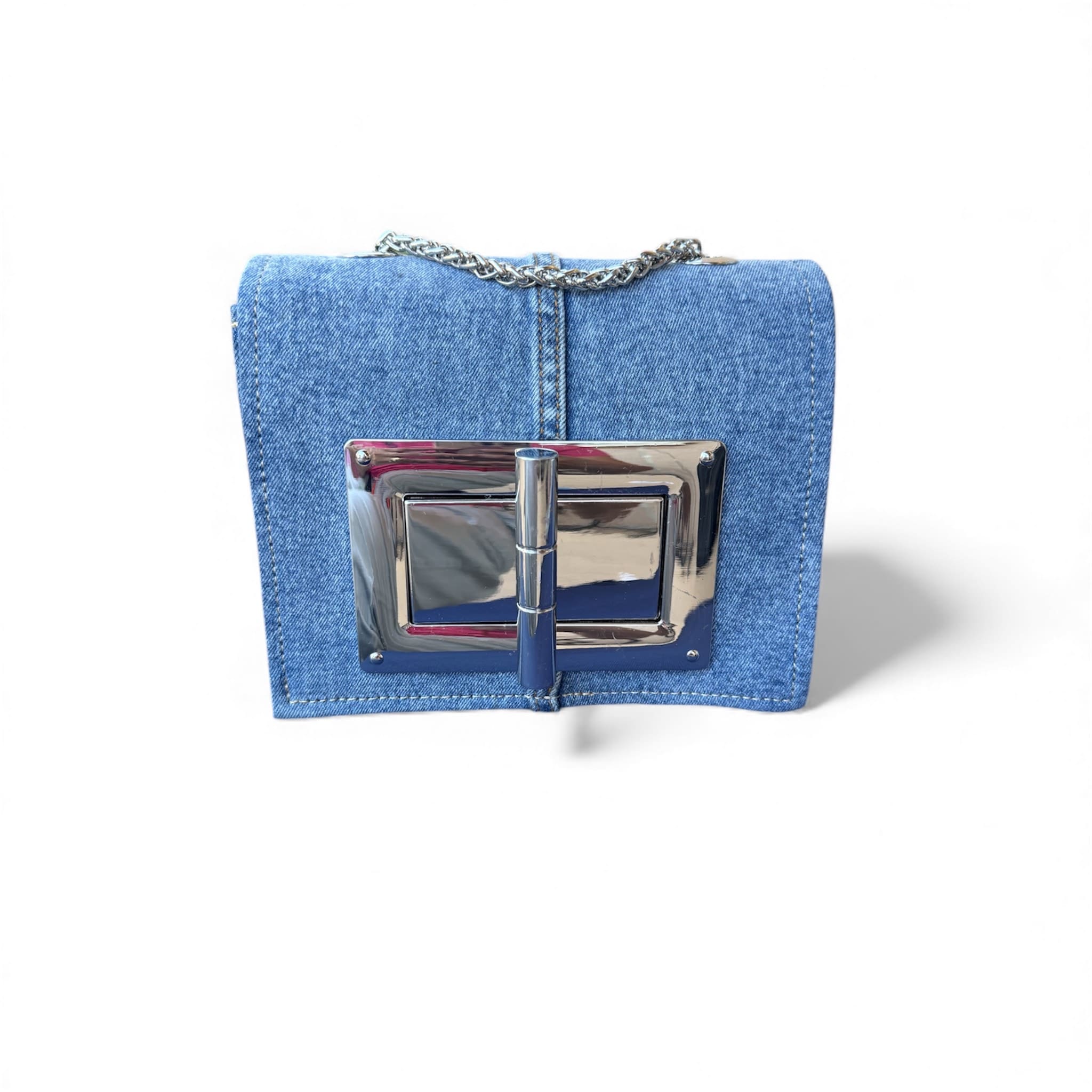 BLUE DENIM BAG WITH AN ELEGANT DESIGN AND BIG METALLIC CLAPS PERFECT FOR AN SPECIAL OCCASION.