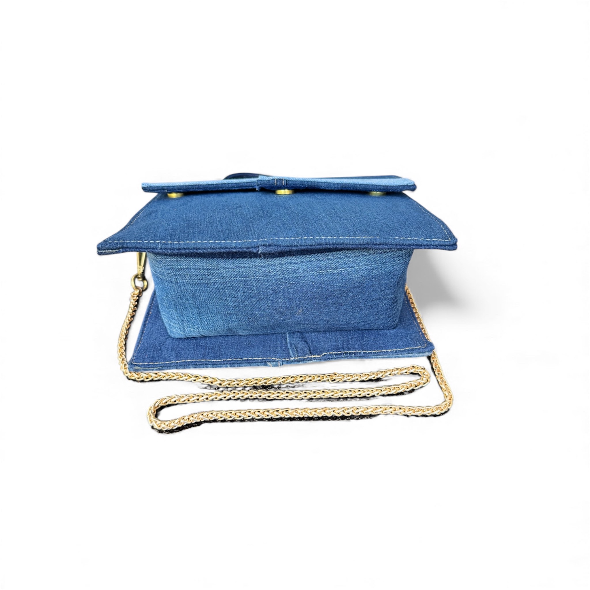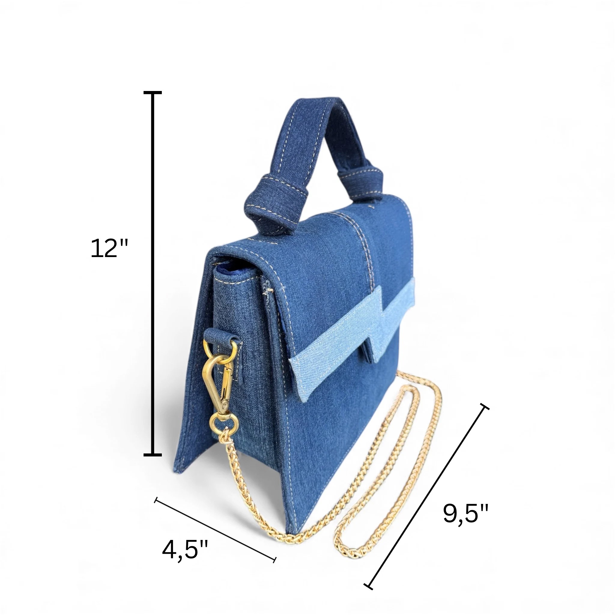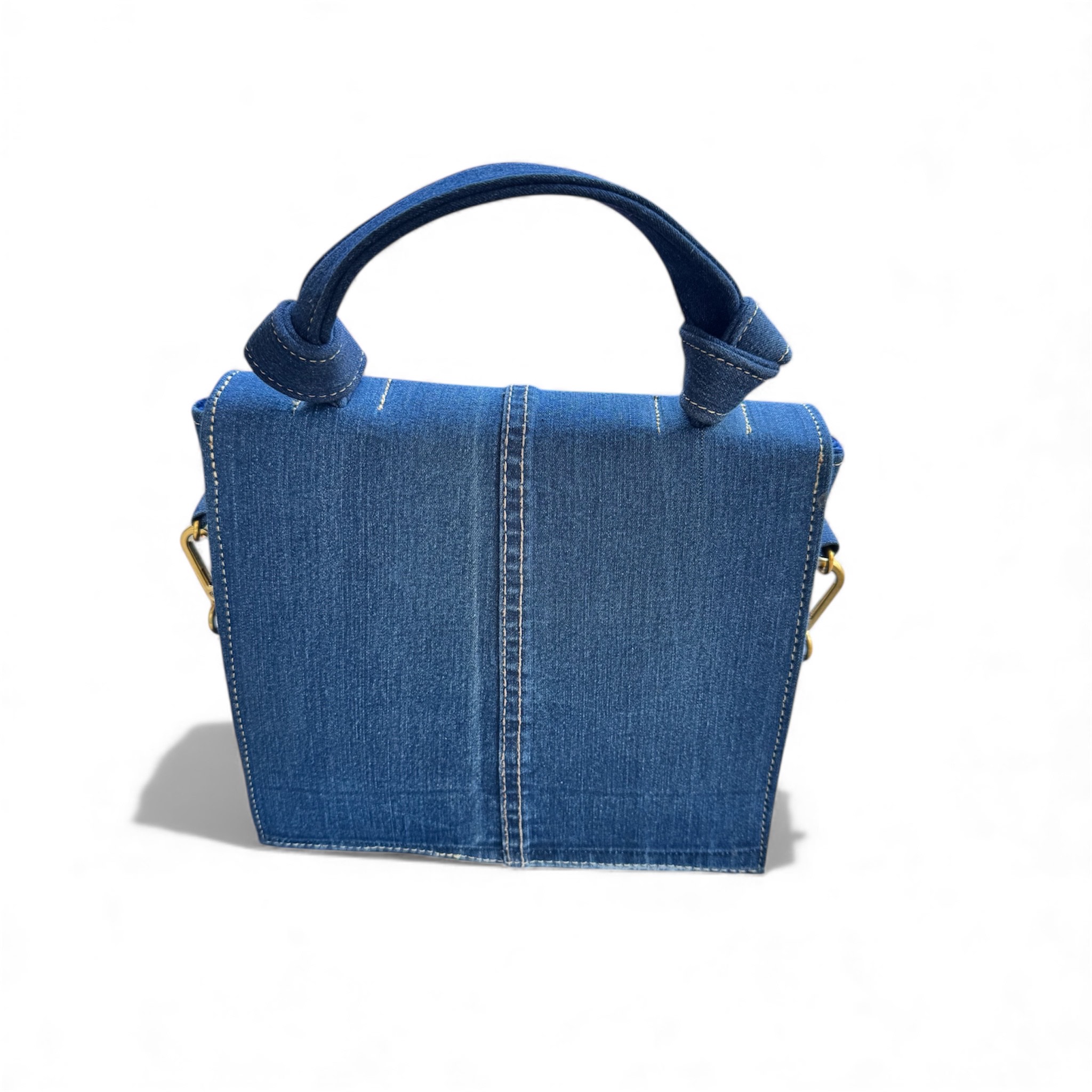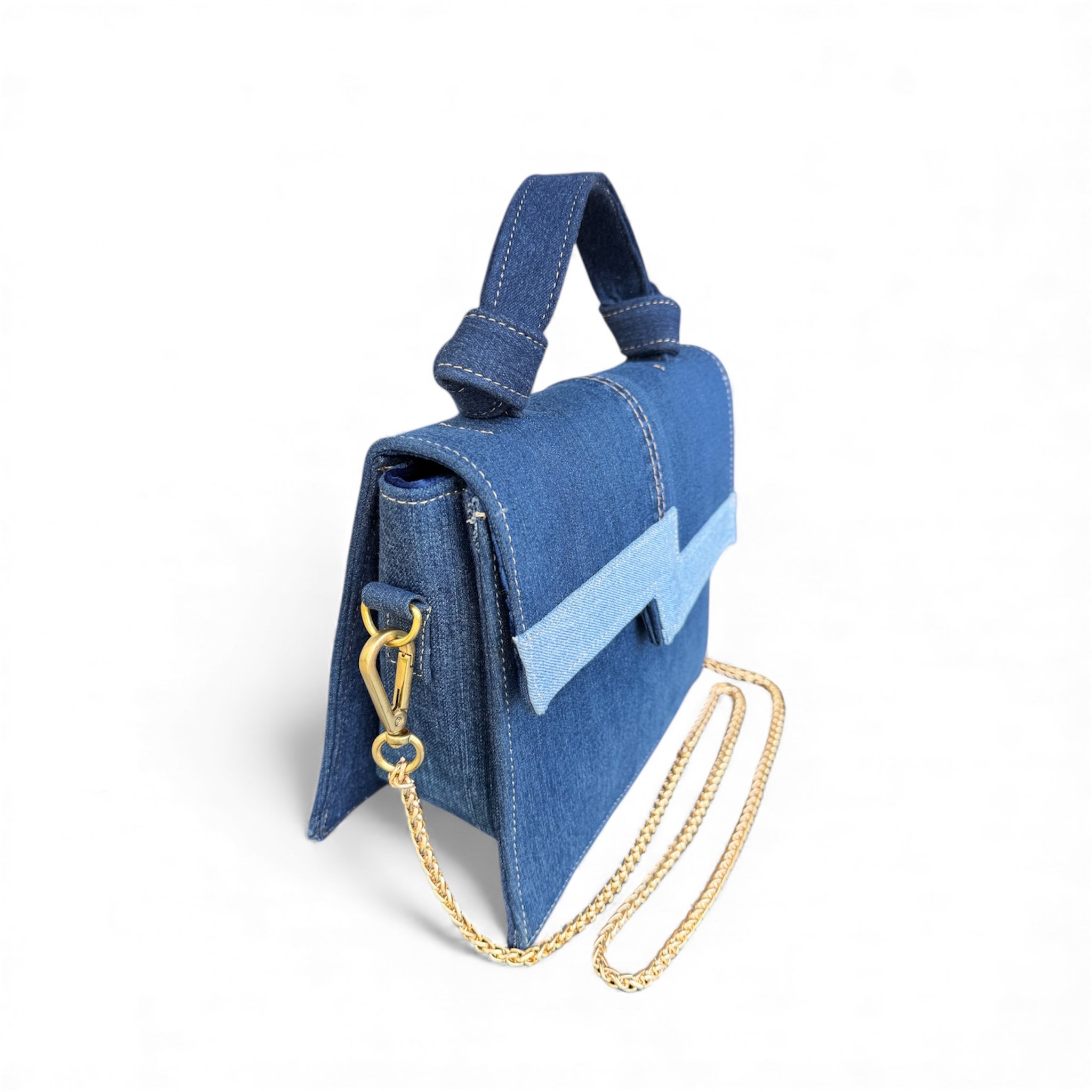 BLUE DENIM BAG WITH A STRUCTURED DESIGN AND MODERN LINES. ITS GEOMETRIC SHAPE AND CONTEMPORARY ATYLE MAKE IT A DISTINTIVE PIECE THAT BLENDS ELEGANCE AND CHARACTER.