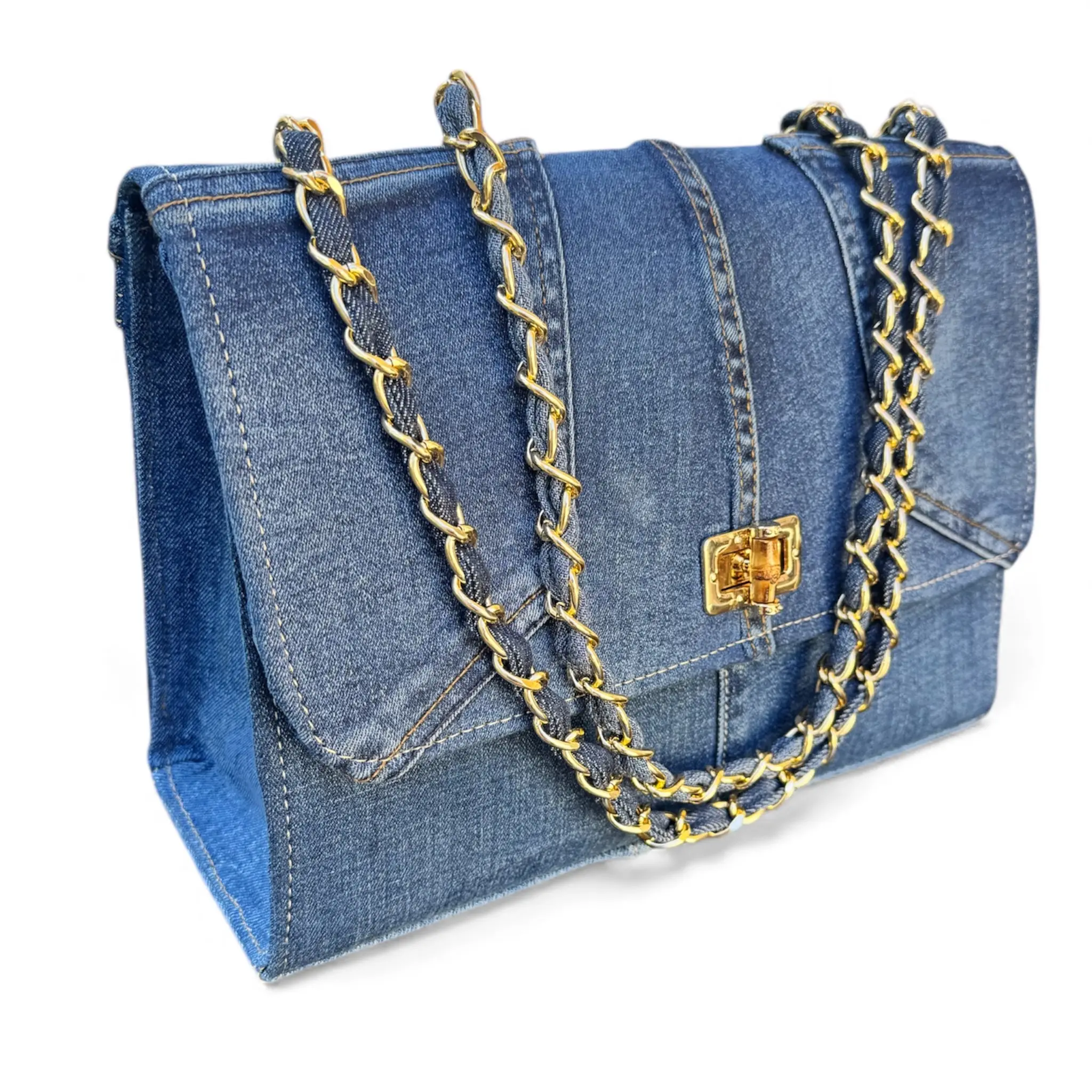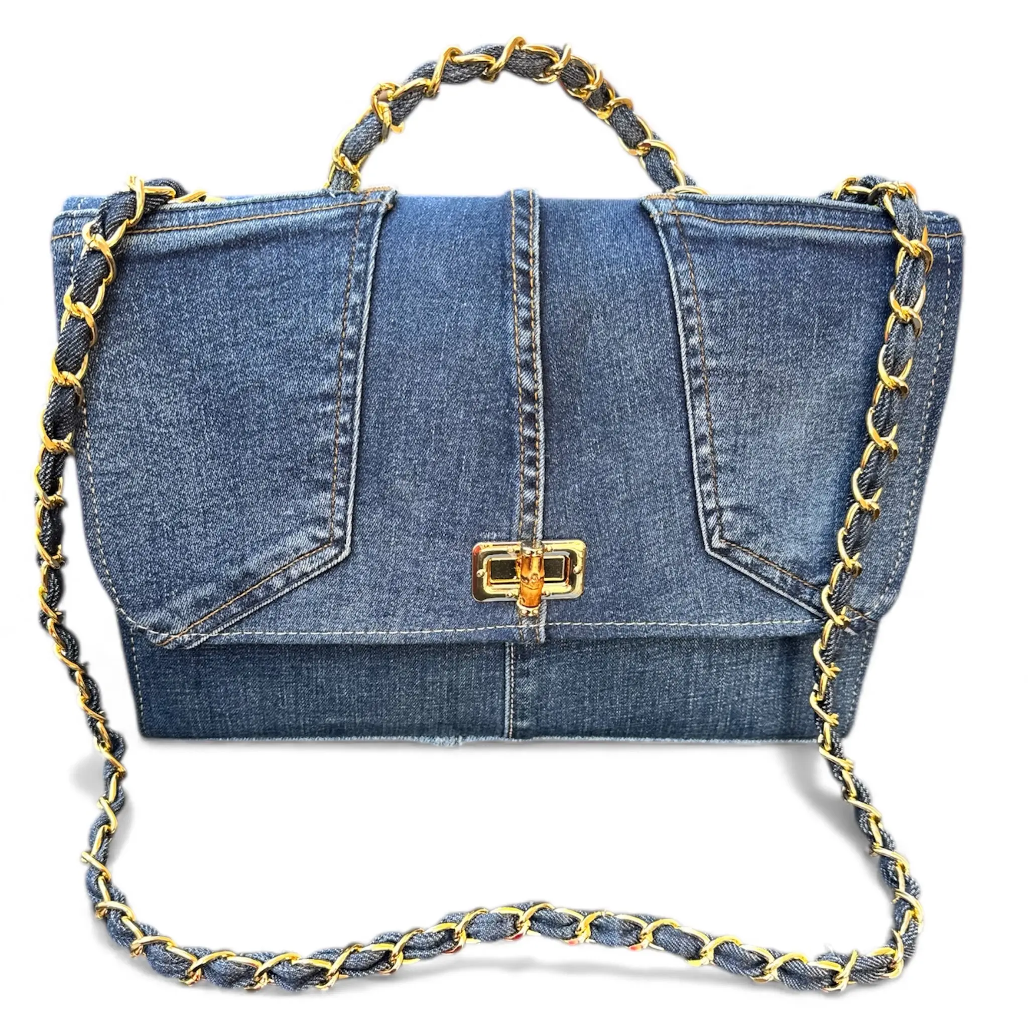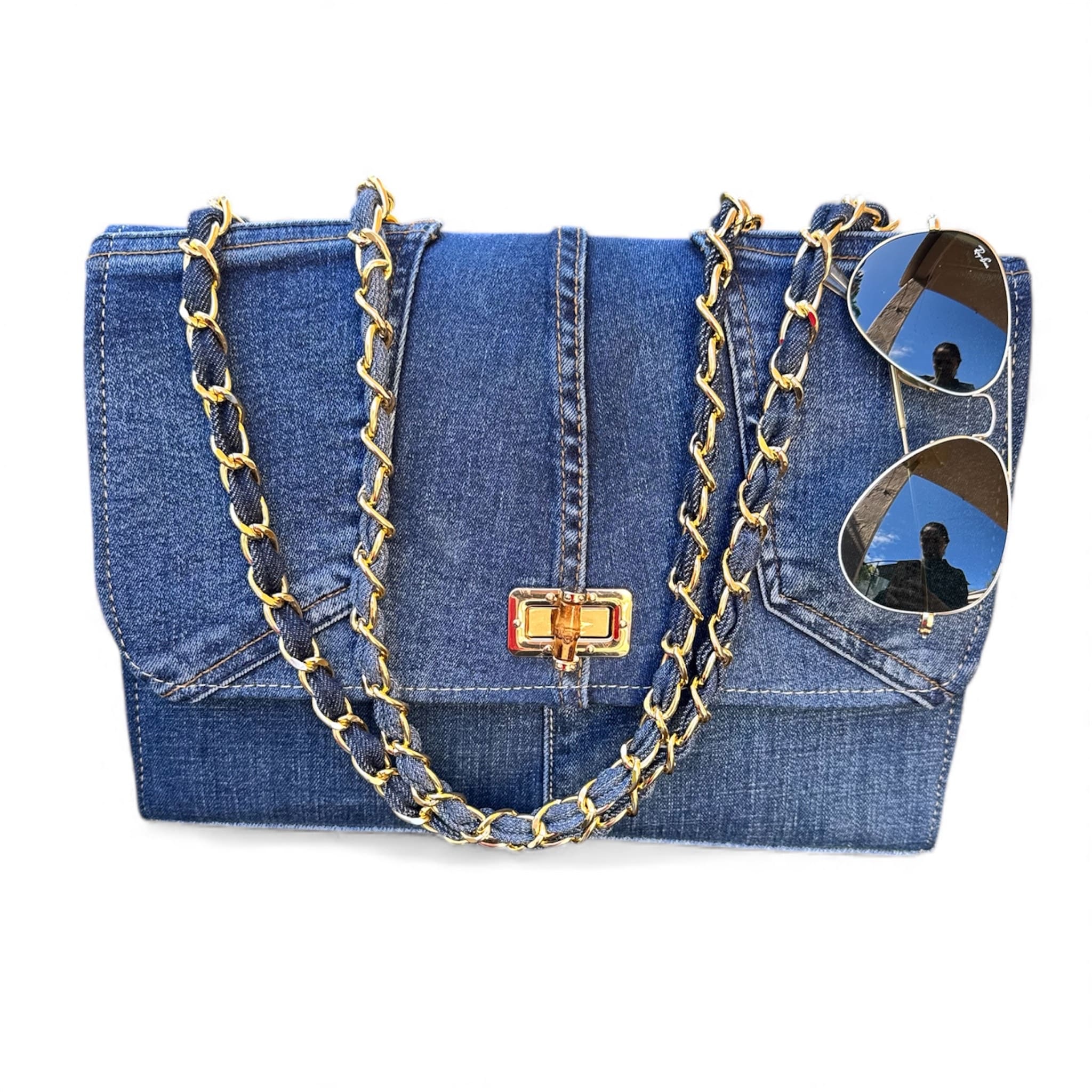 STRUCTURED DEEP-BLUE DENIM BAG WITH A GOLDEN CHAIN. A PERFECT BLEND OF ELEGANCE AND SUSTAINABILITY.
