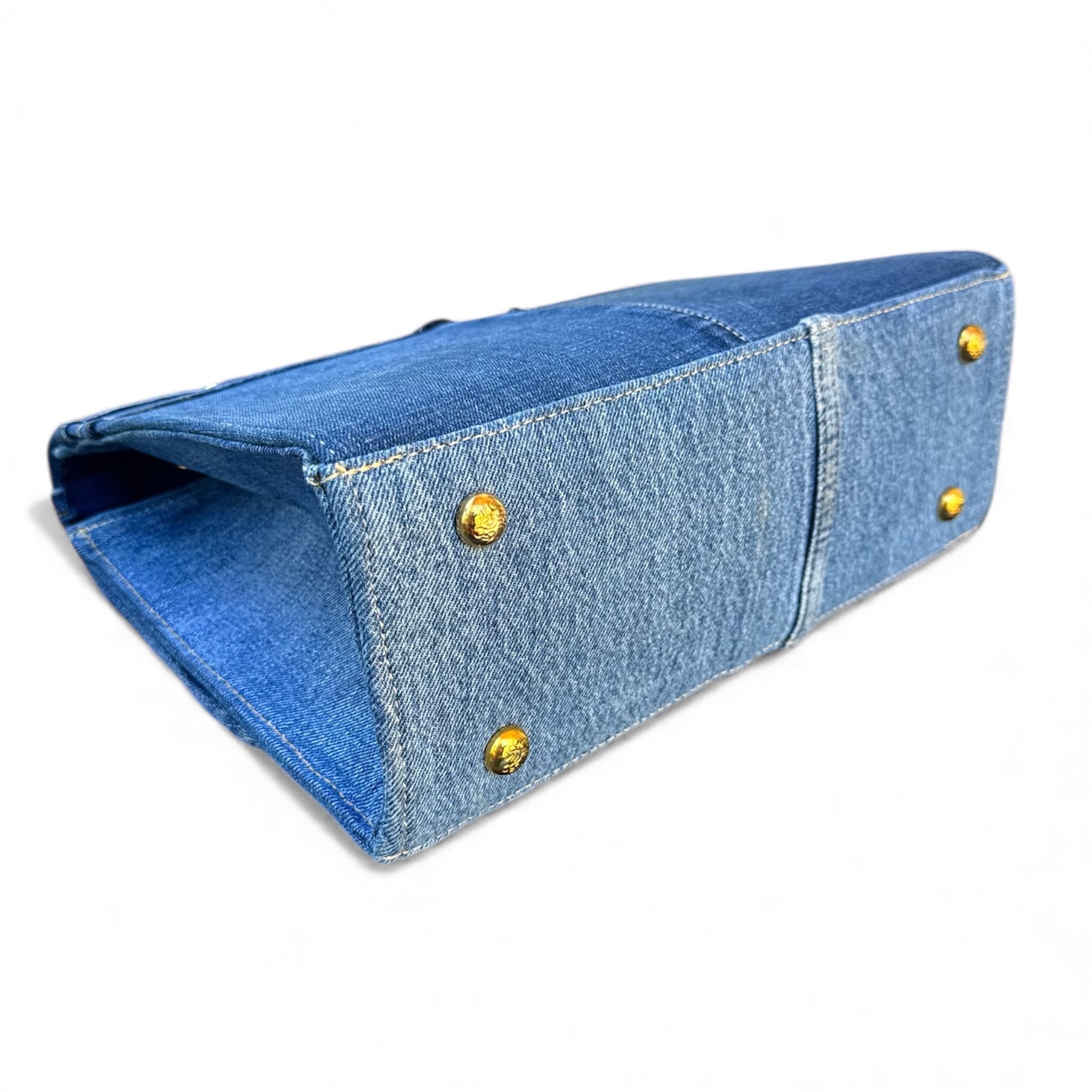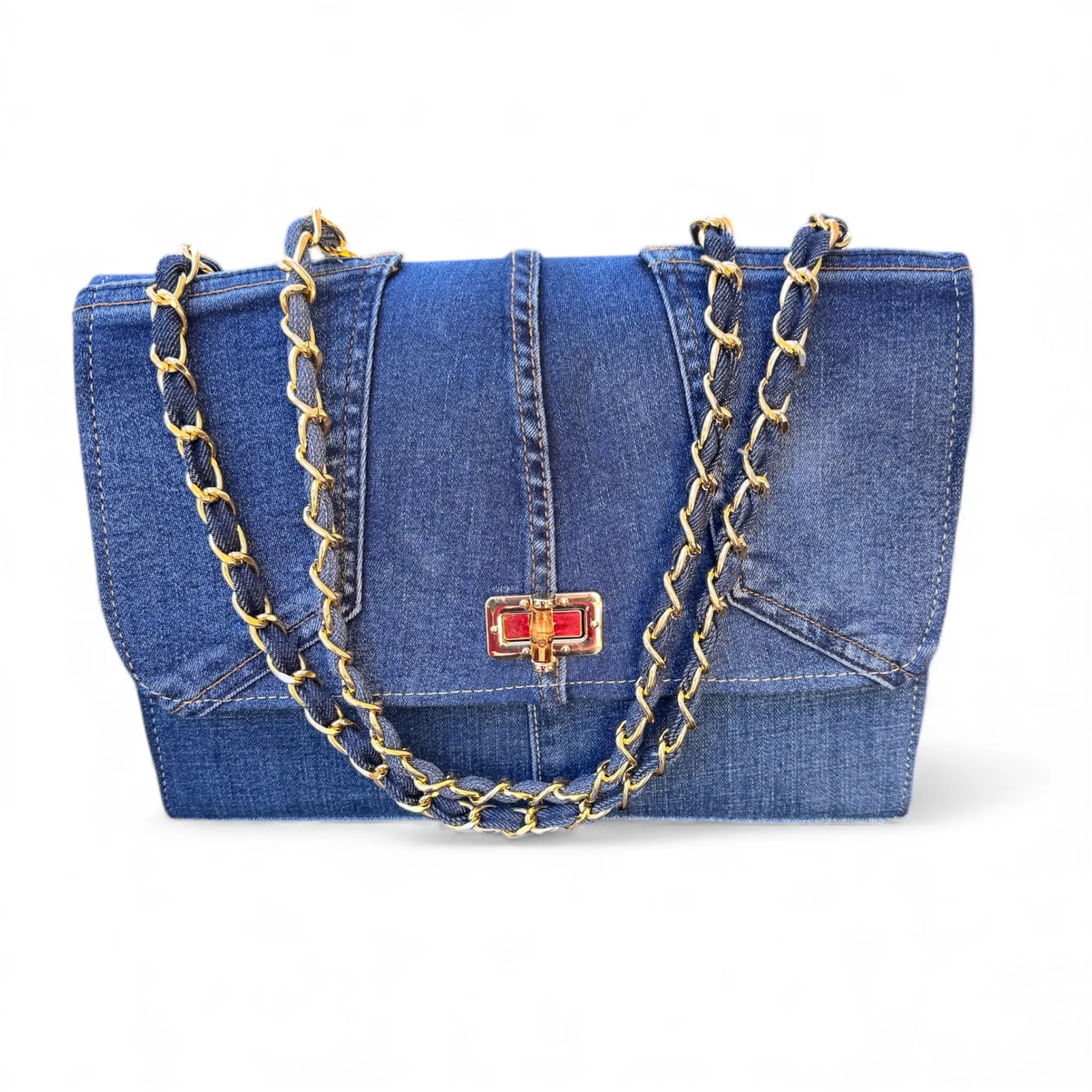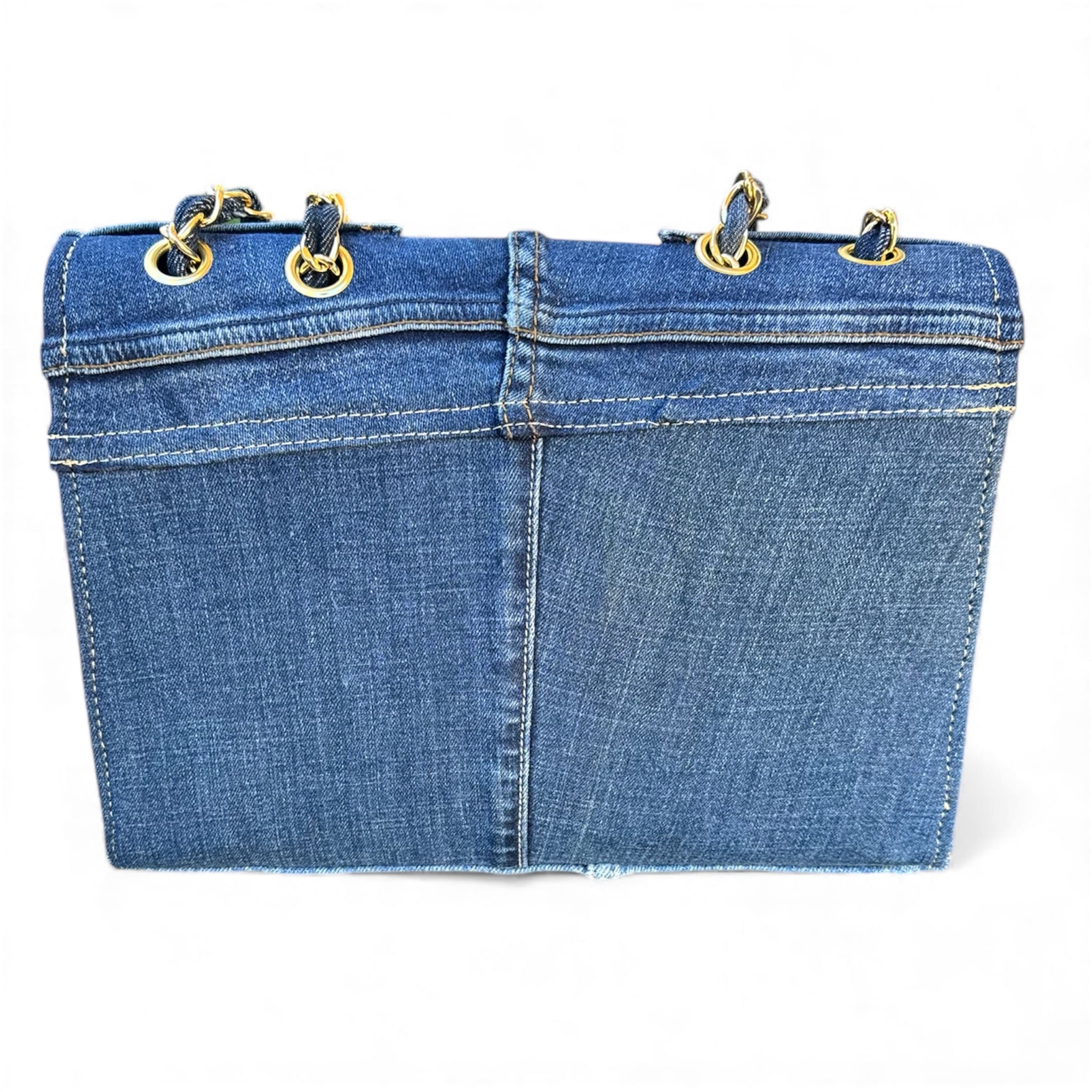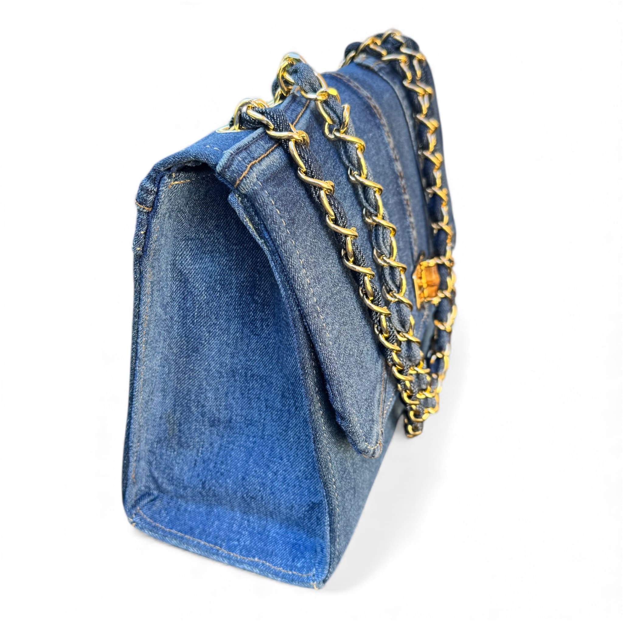 STRUCTURED DEEP-BLUE DENIM BAG WITH A GOLDEN CHAIN. A PERFECT BLEND OF ELEGANCE AND SUSTAINABILITY.
