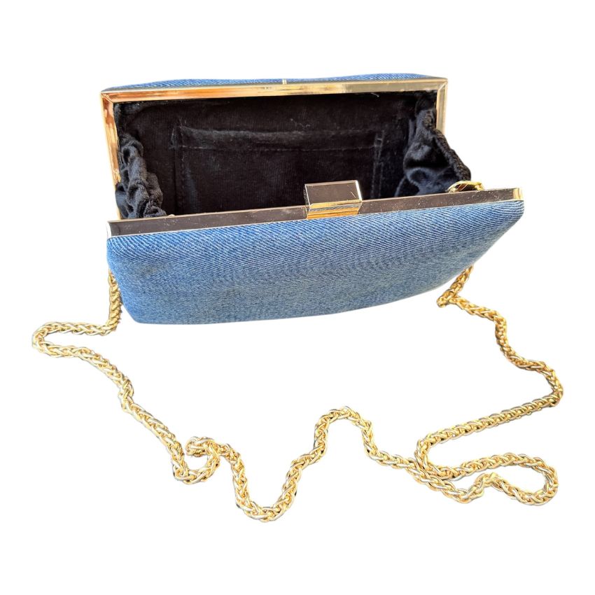 SOPHISTICATED DENIM CLUTCH WITH A GOLDEN CHAIN. AN ELEGANT AND SUSTAINABLE TOUCH FOR SPECIAL OCCASIONS.